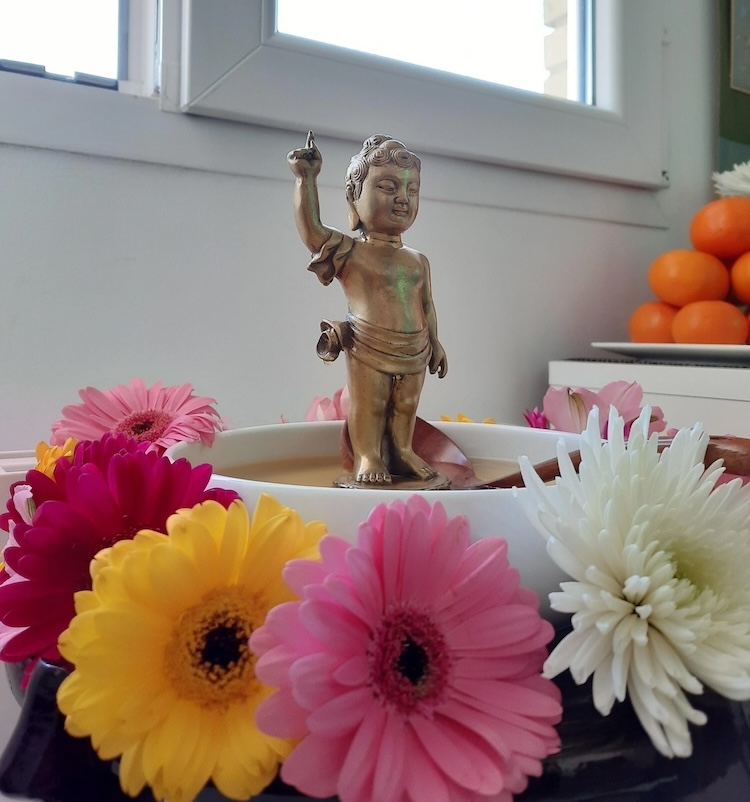 - Create your own Hanamatsuri altar: Find a large serving bowl. Place a statue of something representing the baby Buddha in the middle (this could be anything meaningful to you). Fill the bowl with sweet tea. Arrange flowers around it. See the below image for inspiration.